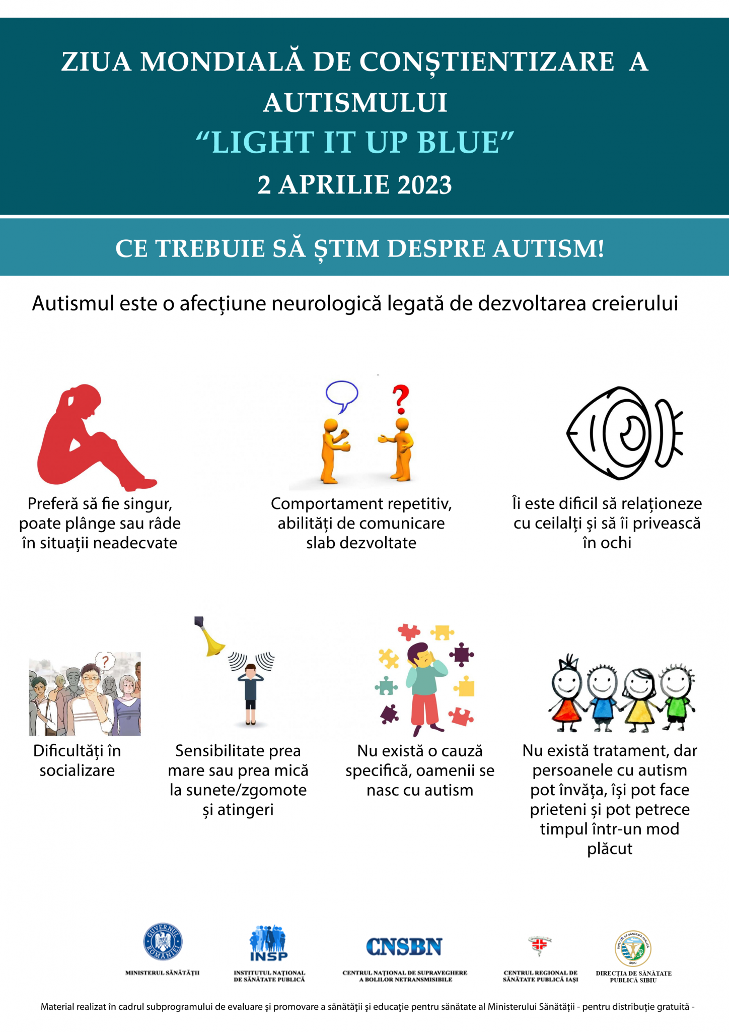 Ziua Mondială de Conștientizare a Autismului reprezintă un prilej de a evidenția și sărbători talentele unice ale celor cu autism, pe tot globul. În acest scop și pentru a marca această zi, populația este încurajată să poarte haine albastre și să-și lumineze în albastru locuința sau locul de muncă.