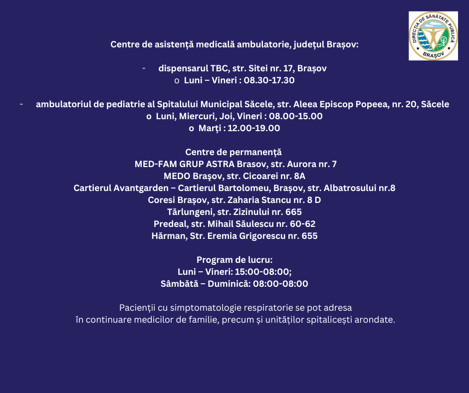 Pacienții cu simptomatologie respiratorie se pot adresa în continuare medicilor de familie, precum și unităților spitalicești arondate.