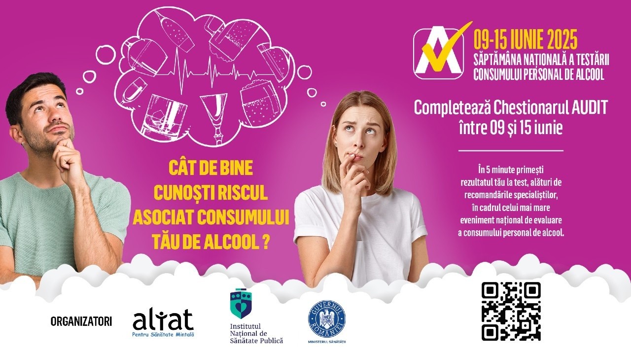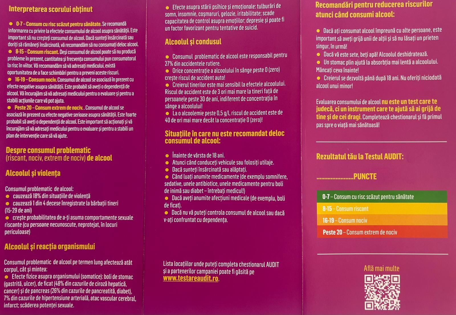 Populația adultă este invitată să-și cunoască riscul asociat consumului de alcool prin parcurgerea chestionarului AUDIT. Prin completarea acestui chestionar se obțin rezultate individuale privind nivelul consumului de alcool și se poate interveni pentru a reduce consumul dăunător de alcool.
