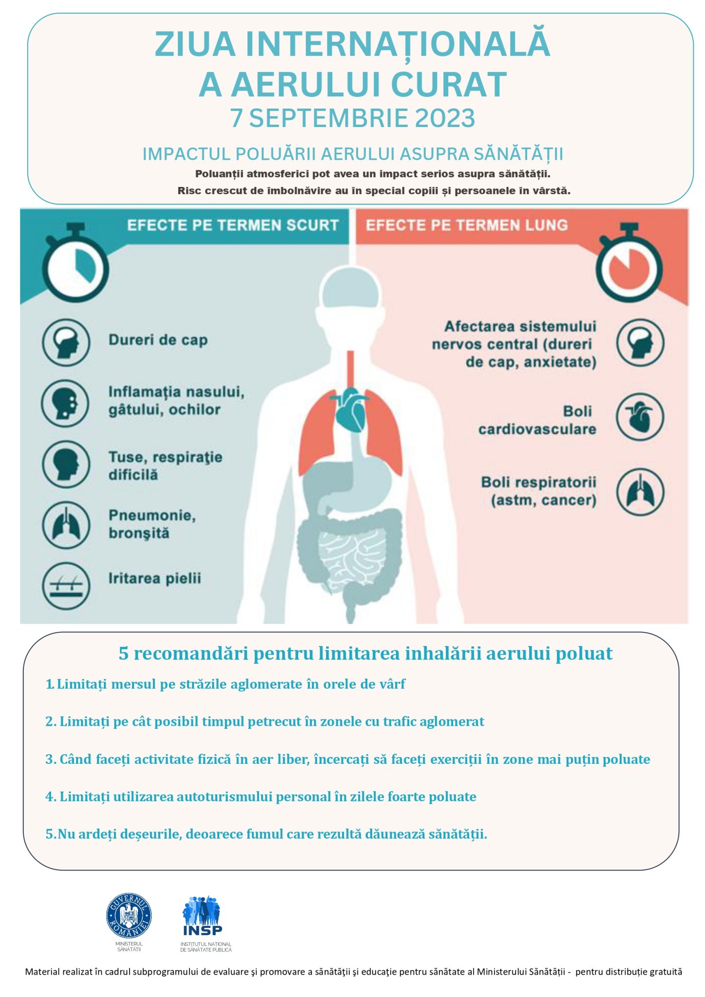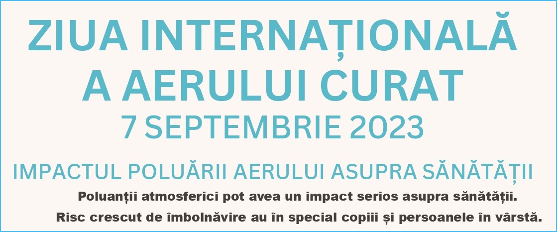 De Ziua Internaţională a Aerului Curat Pentru un Cer Albastru, 7 septembrie 2023, Institutul Național de Sănătate Publică și Direcția de Sănătate Publică Brașov se alătură organizațiilor internaționale care recunosc „valoarea aerului pe care îl respirăm cu toții” și necesitatea unor eforturi de colaborare concertate pentru a reduce emisiile poluante, în scopul protejării atât a mediului cât şi a sănătăţii umane.