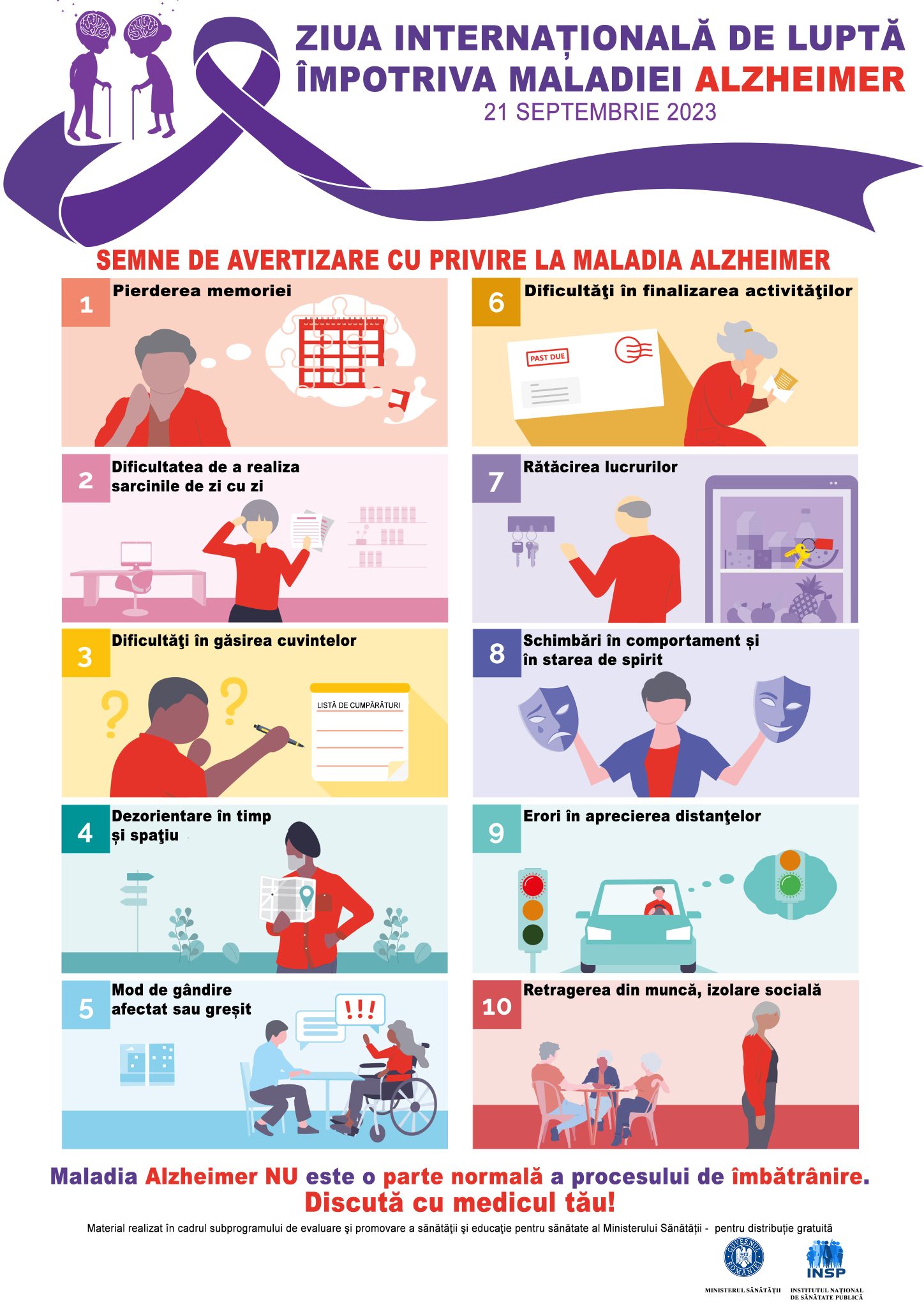 Ziua Internațională de Luptă împotriva maladiei Alzheimer, lansată în anul 1994 sub umbrela federației internaționale, Alzheimer Disease International (ADI) și sub patronajul Organizației Mondiale a Sănătății, este marcată în fiecare an pe data de 21 septembrie. Anul acesta, este subliniat aspectul conştientizării rolului esențial al identificării factorilor de risc și a semnelor timpurii ale demenței pentru adoptarea de măsuri proactive de reducere a riscului şi de prevenire a apariției acesteia.