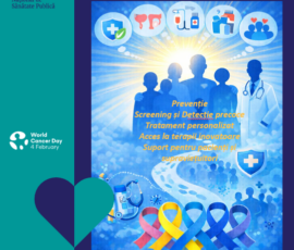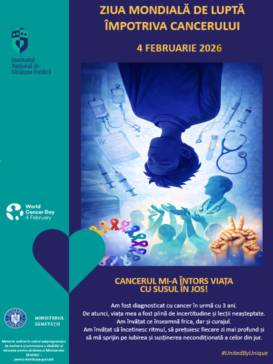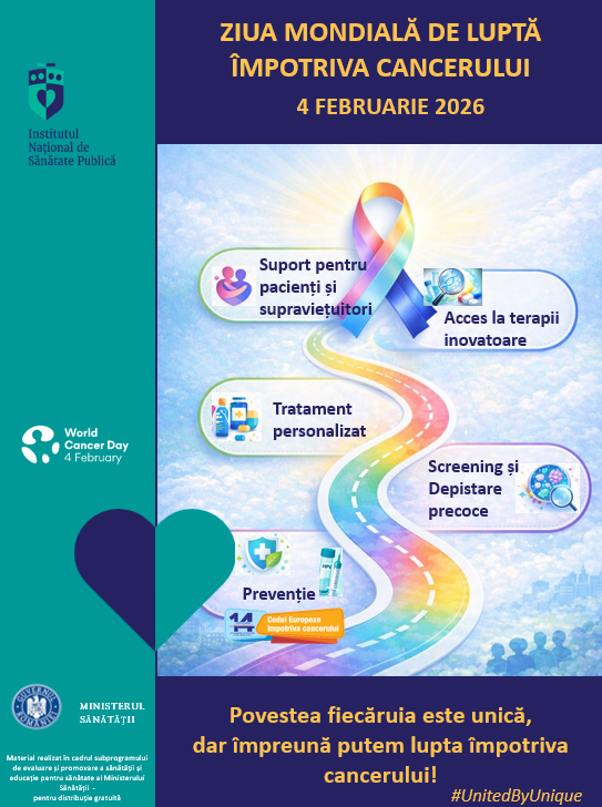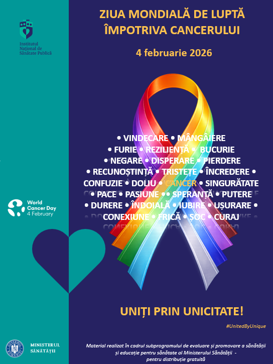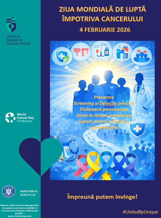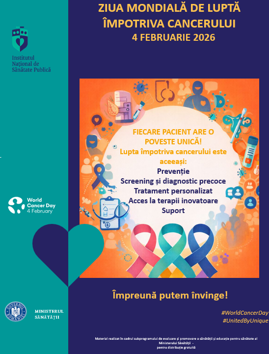 Cu ocazia Zilei Mondiale de Luptă Împotriva Cancerului, 4 februarie 2026, Institutul Național de Sănătate Publică se alătură eforturilor europene și internaționale de informare și conștientizare a impactului cancerului asupra societății și invită profesioniștii din domeniul sănătății și populația generală să se implice activ în promovarea prevenției, a unui stil de viață sănătos și a sprijinului acordat persoanelor afectate de cancer.