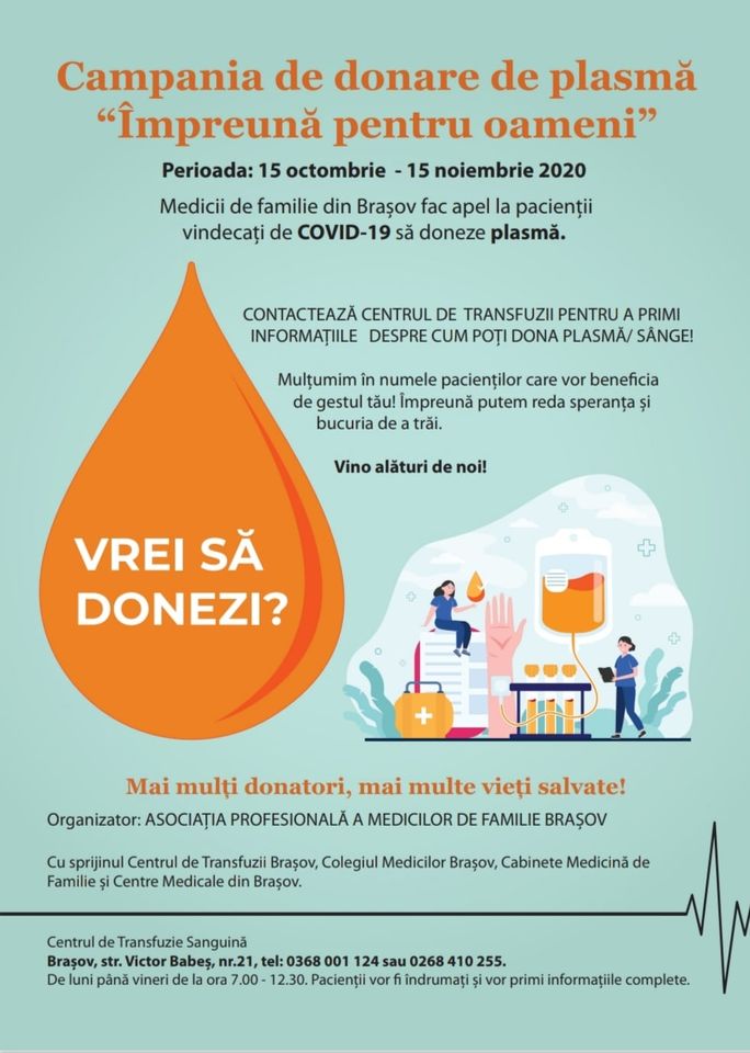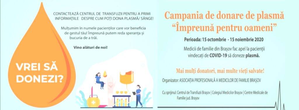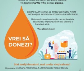„Centrul de Transfuzii mulțumește Asociației Medicilor de Familie din Brașov pentru inițiativă, precum și tuturor donatorilor. Este important de știut că nevoia de plasmă și sânge este în continuă creștere. Facem și noi apel la pacienții vindecați de Covid 19 să vină să doneze cu încredere plasmă covalescentă sau sânge.” Dr. Camelia Roșu, director Centrul de Transfuzie Sanguină Braşov.