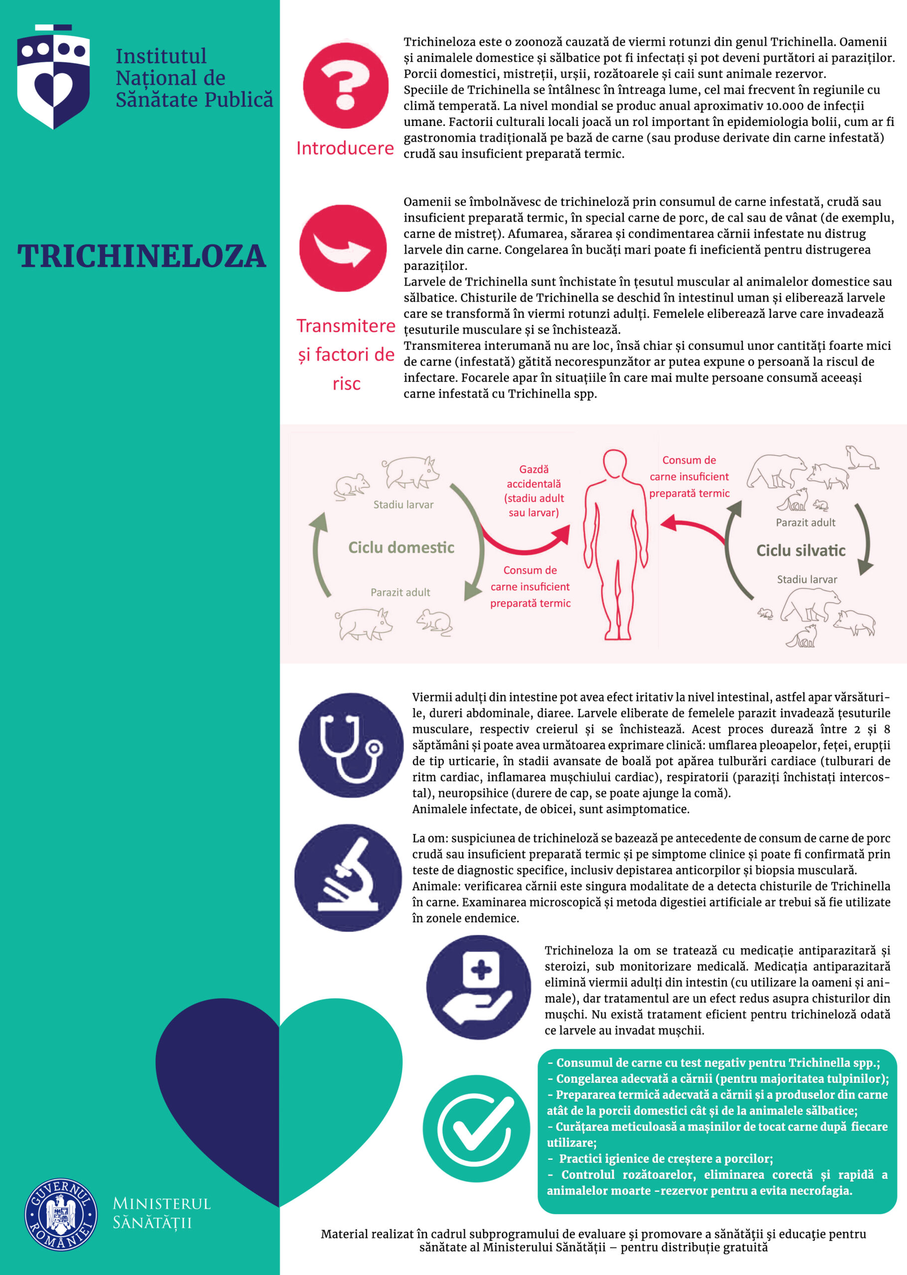 Atenție! Oamenii se îmbolnăvesc de trichineloză numai prin consumul de carne crudă insuficient gătită, provenită de obicei de la porcul din gospodărie sau comercializată inadecvat, neautorizată sanitaro-veterinar. Recomandarea fermă este de testare a cărnii de porc sau de mistreț.