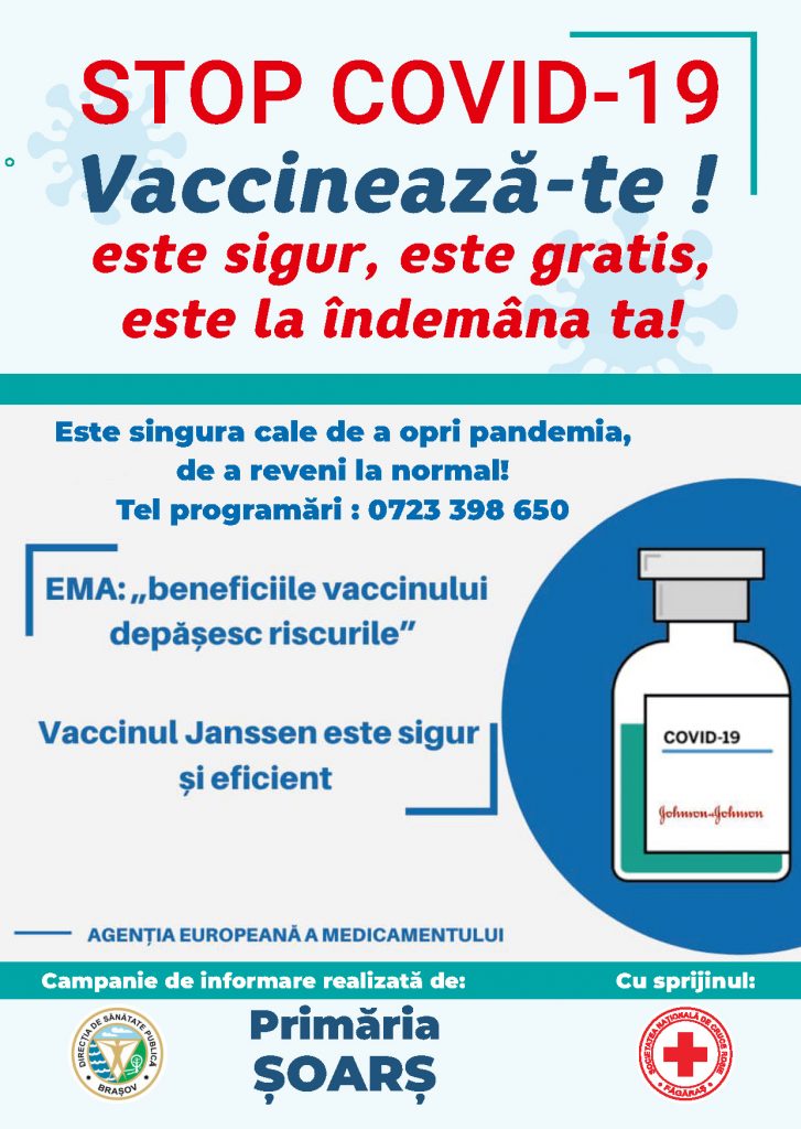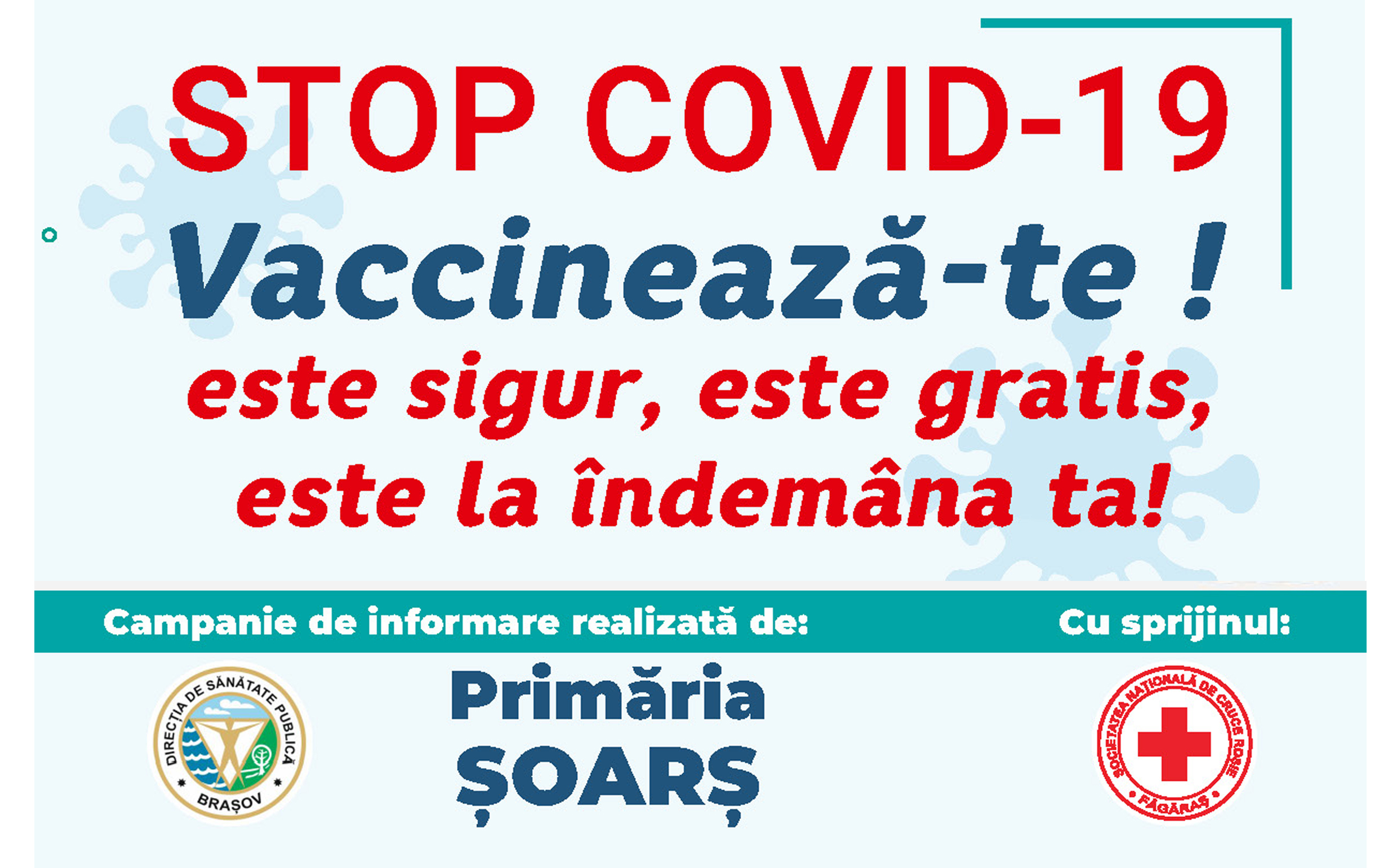 În cadrul campaniei „Mai aproape pentru vaccinare” a Direcției de Sănătate Publică Brașov, în weekend-ul 29-30.05.2021, echipe formate din reprezentanți ai DSP Brașov, Primăria Șoarș însoțite de voluntari ai Subfilialei Făgăraș a Crucii Roșii, organizează o acțiune de informare „door to door” cu privire la beneficiile vaccinării în cele 5 sate ale Comunei Șoarș.